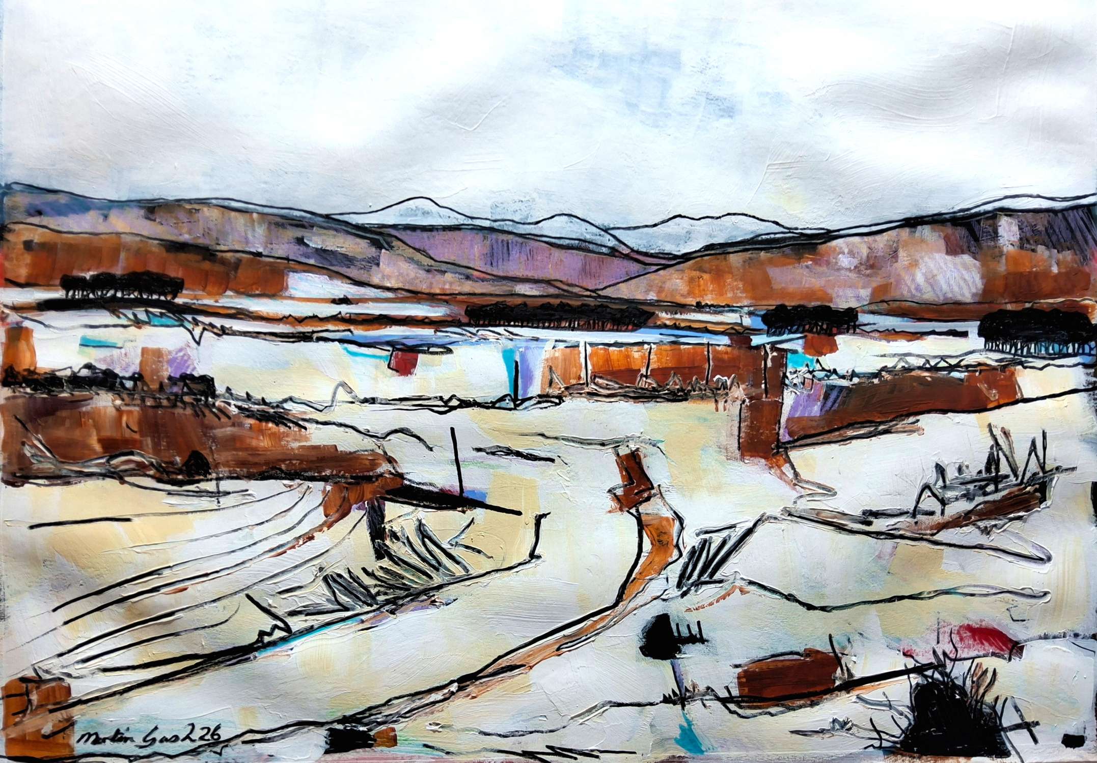 Martin Gash Late Winter Snow. Looking Towards The Pentlands Mixed Media on paper Framed: 58 x 79 cm £700 734583 Enquire about this piece View full screen View in room More by this Artist ADD TO BASKET